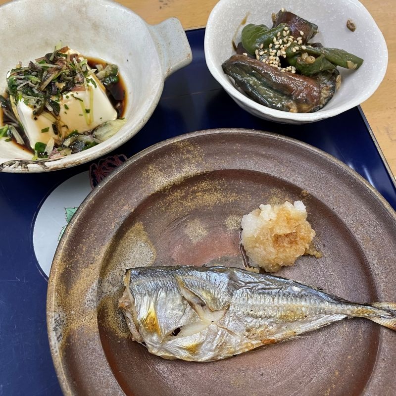 大根おろしを添えた塩焼きも超美味しかったです~。左上は冷ややっこ、右上は茄子🍆とピーマン🫑のもろみ炒めです。