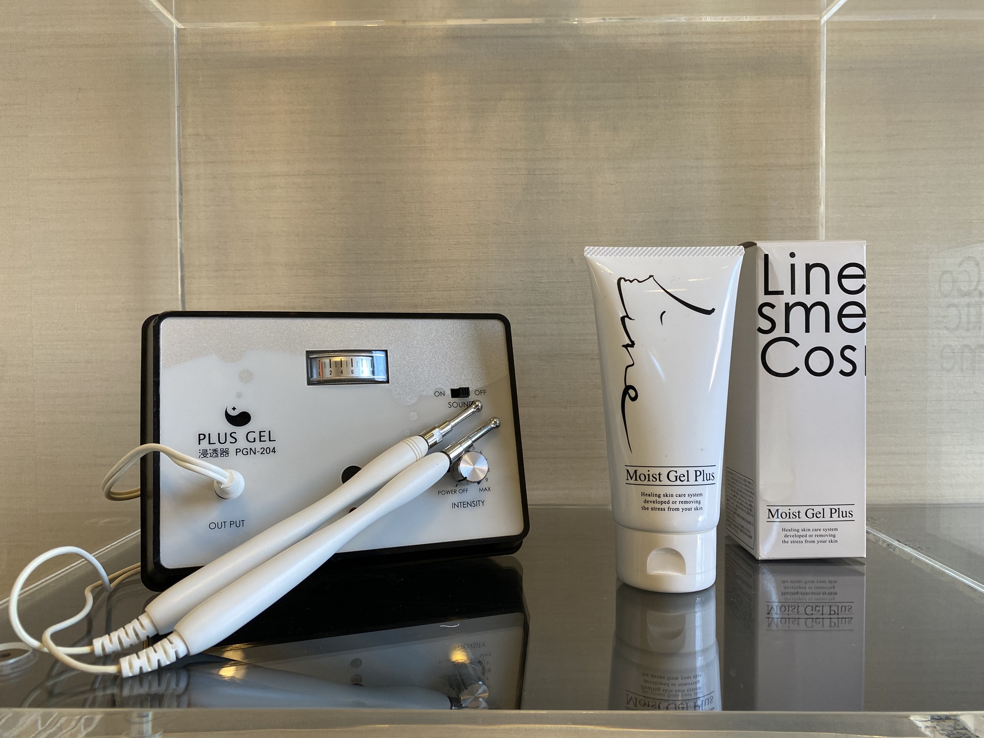 下の画像、は先代のゲルと浸透器です。浸透器をかけながら半顔に塗るのでキャップが明けにくいなどがあり、今回はポンプ式に改良しました。もちろん、内容も